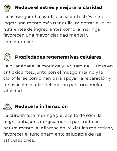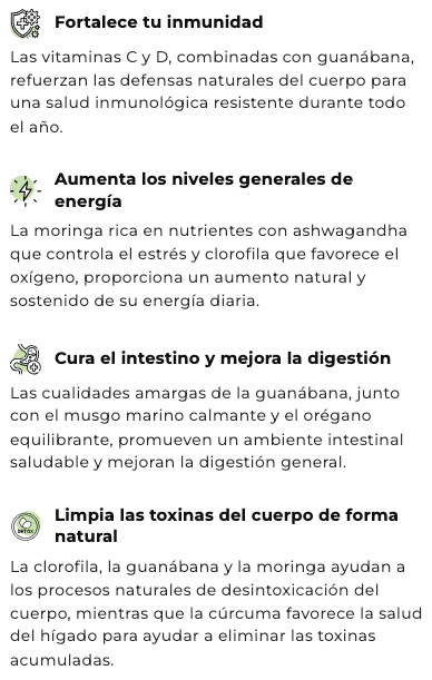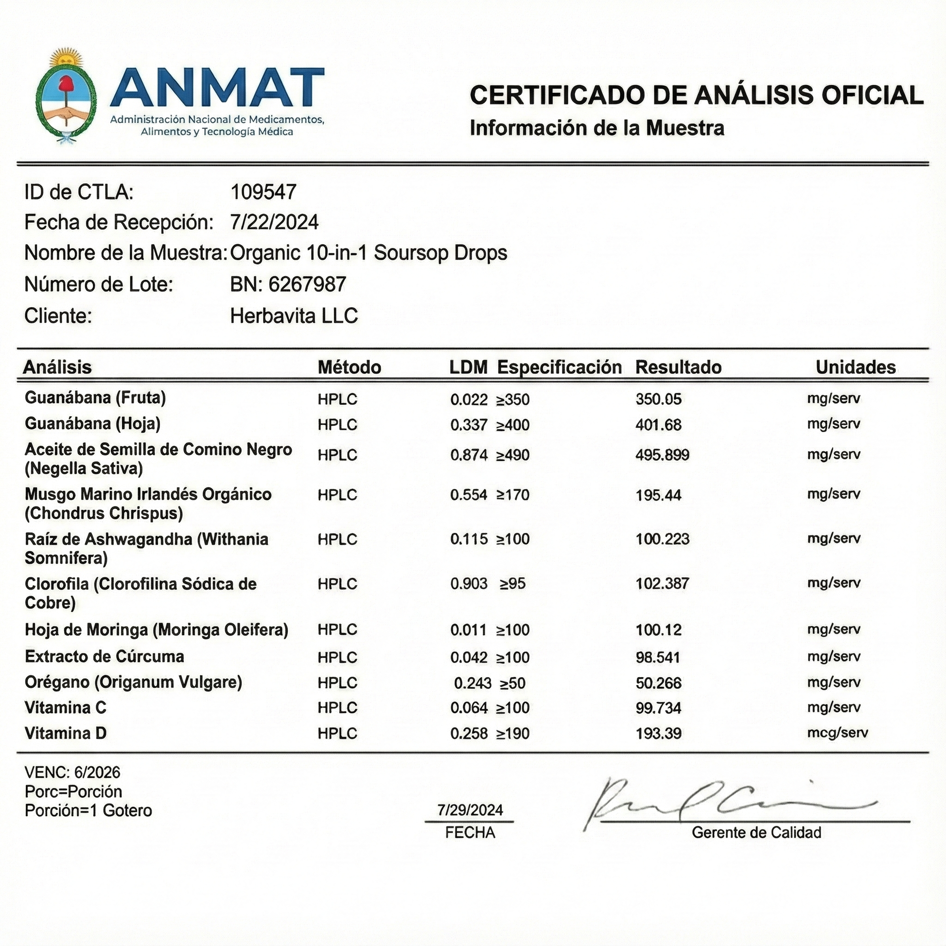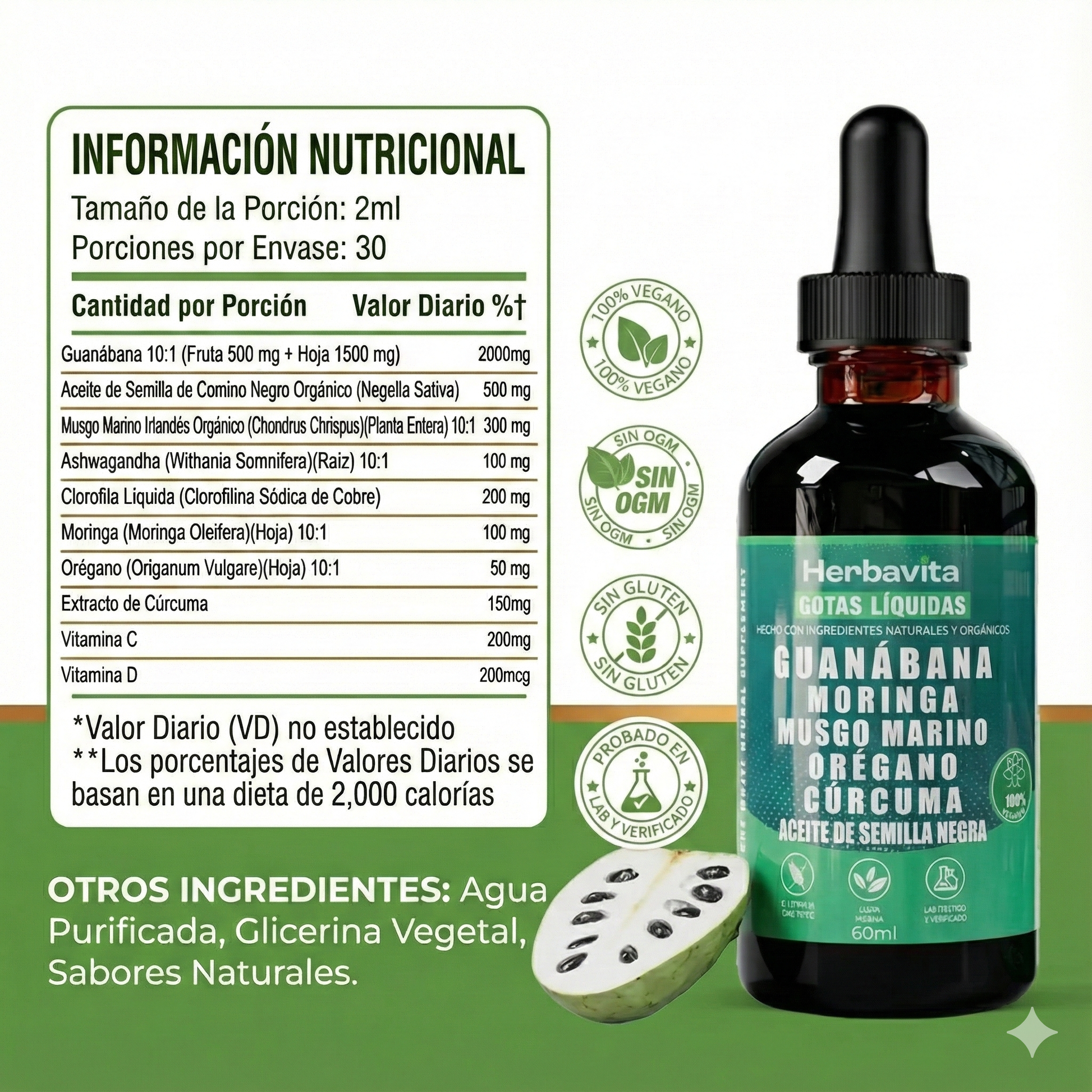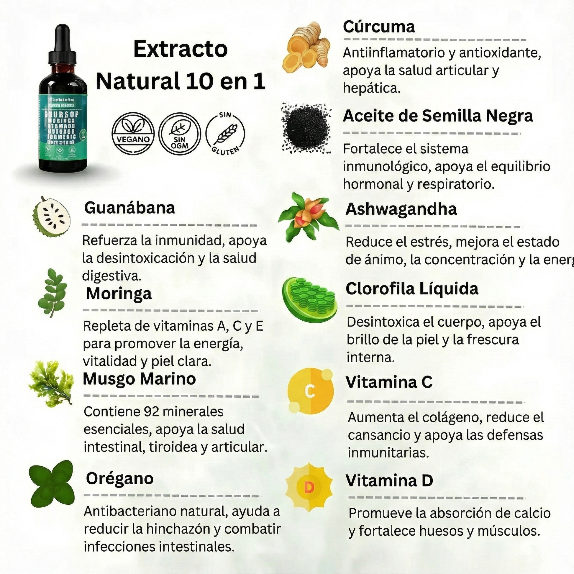 Cientos de profesionales de la salud confían en nuestras gotas de extracto de guanábana 10 en 1, tu solución natural. Desde guanábana y musgo marino hasta ashwagandha, moringa y orégano, cada ingrediente ha sido seleccionado por sus beneficios únicos para la salud. Esta solución integral elimina la necesidad de comprar múltiples suplementos, brindándote una potente dosis diaria para mejorar tu energía, inmunidad y bienestar general.