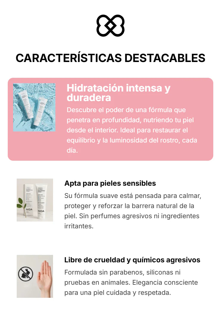 La fórmula de VITA combina el poder del [Nombre del Ingrediente, ej: Ácido Hialurónico] para una hidratación profunda, con extractos naturales que calman y revitalizan el rostro. Además, es un producto dermatológicamente testeado, libre de parabenos y Cruelty Free (no testeado en animales), garantizando el máximo cuidado para tu piel sin químicos agresivos.